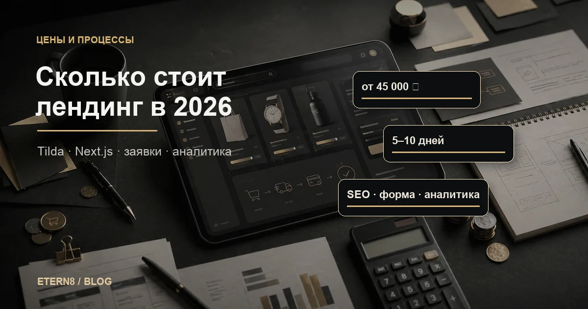 Если нужно начать с меньшего формата, посмотрите разбор «сколько стоит лендинг». А общий формат работы ETERN8 описан на странице «разработка на Next.js».